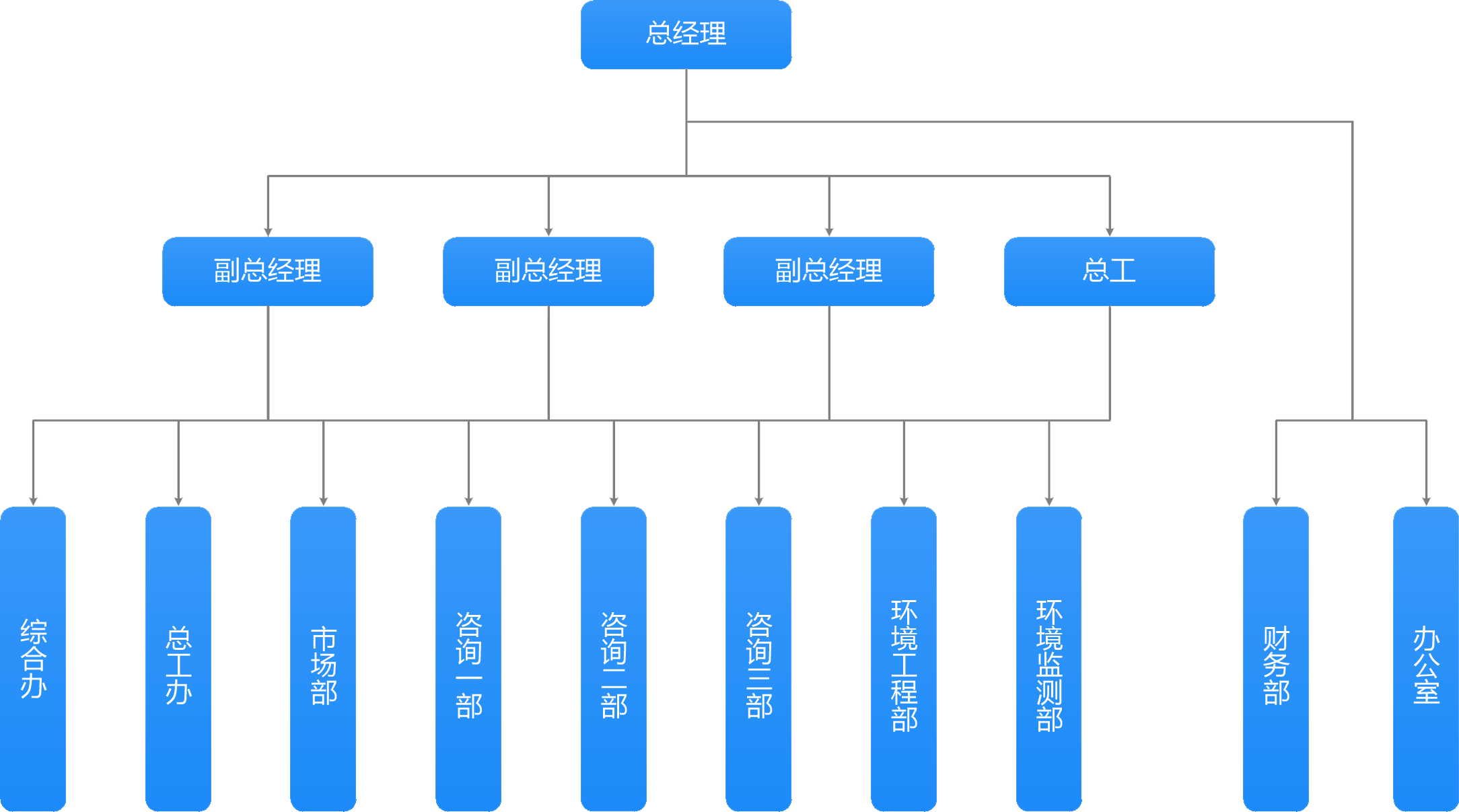 公司下設綜合辦、總工辦、市場部、咨詢一部、咨詢二部、咨詢三部、環境工程部、環境監測部(籌備),擁有一套完善的內部管理制度,在質量管理方面按照生態環境部的要求,建立了一套完整的質量管理體系,對咨詢進行全過程質量管理。